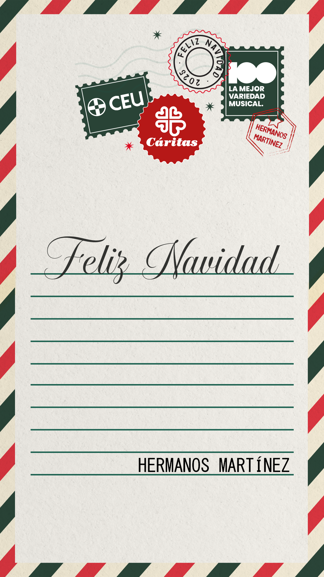 18 de diciembre de 2025. Cáritas, el CEU y CADENA 100 han presentado este jueves el tradicional villancico que cada año acompaña la campaña de Navidad de esta institución de la Iglesia. En esta ocasión, los protagonistas son los Hermanos Martínez, quienes, junto a los niños del coro del Colegio CEU San Pablo Sanchinarro, han puesto su voz a este proyecto solidario con una pieza inédita titulada “Feliz Navidad”.
