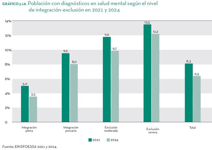 La dada més greu és que el 6% de les famílies més vulnerables que tenien una malaltia greu no va rebre atenció mèdica l’any passat. El doble que en el conjunt de la societat. La salut mental també es ressent. Els diagnòstics de depressió, ansietat o trastorn adaptatiu aconsegueixen al 6% de la societat, però superen el 12% entre els qui viuen en exclusió severa. “L’informe posa sobre la taula que quan el sistema públic s’embussa, i retarda la detecció precoç de malalties, o no cobreix completament punts fonamentals com la salut mental, l’única alternativa és el pagament, convertint un dret fonamental en un privilegi”, va postil·lar.