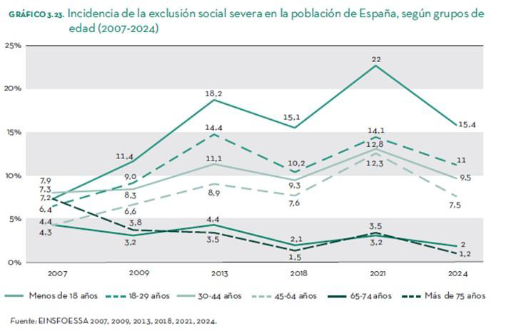 Els grans perdedors del model socioeconòmic actual són els joves i els nens. Un terç de tota l’exclusió severa a Espanya correspon a menors d’edat, la taxa de pobresa de la qual se situa en el 29%, la més alta de tots els grups d’edat i de les majors d’Europa. A ells se suma bona part de la joventut que viu una situació de bloqueig vital: 2,5 milions de joves estan atrapats en una precarietat estructural, enfrontant taxes de temporalitat, parcialitat involuntària i salaris baixos que dupliquen la mitjana espanyola.