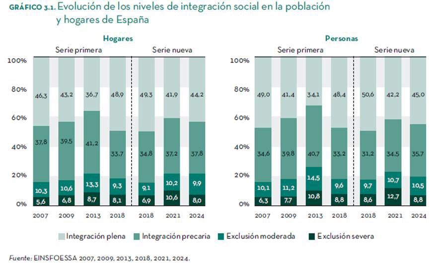 Espanya travessa un procés inèdit de fragmentació social: la classe mitjana es contreu desplaçant a moltes famílies cap a estrats inferiors. Després de dues dècades de crisis encadenades, les fases de recuperació no han tancat la bretxa i han portat a Espanya a comptar amb una de les taxes de desigualtat més altes d’Europa. La integració social s’erosiona i l’exclusió greu roman molt per sobre dels nivells de 2007. En 2024, l’exclusió severa se situa un 52% per sobre de 2007, la qual cosa llança un saldo de 4,3 milions de persones.
