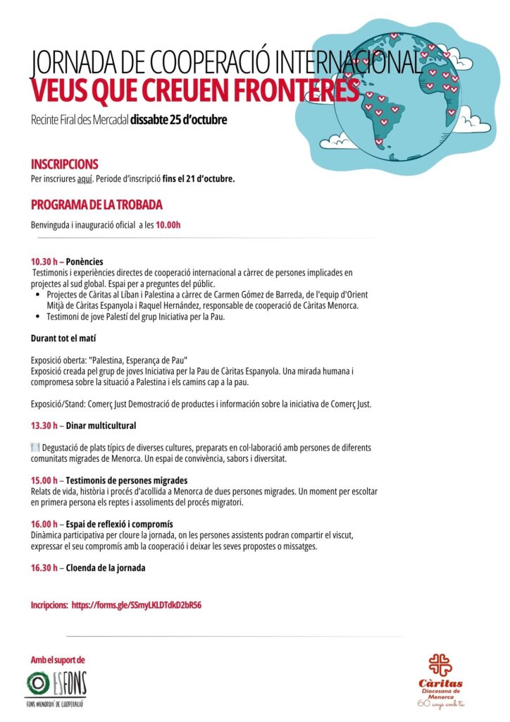 La jornada començarà a les 10.00 h amb la benvinguda i inauguració oficial, i continuarà amb ponències i testimonis directes de persones implicades en projectes de cooperació internacional. Entre els participants hi haurà Carmen Gómez de Barreda, de l’equip d’Orient Mitjà de Càritas Espanyola, i Raquel Hernández, responsable de cooperació de Càritas Menorca, que presentaran projectes al Líban i Palestina, així com el testimoni d’un jove palestí del grup Iniciativa per la Pau.